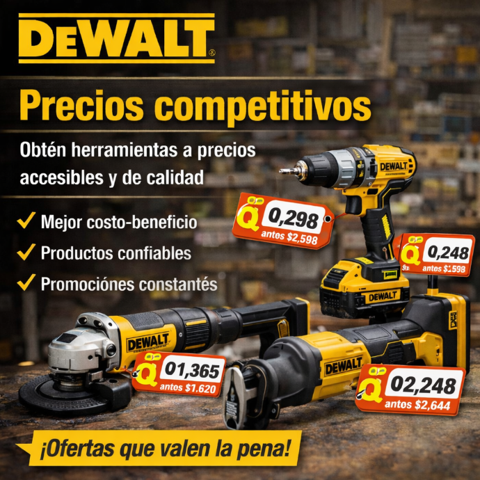 DEWALT Ofrecemos precios competitivos sin sacrificar calidad. Trabajamos para brindarte las mejores herramientas al mejor costo del mercado, asegurando una excelente relación precio–beneficio. Con nosotros obtienes productos confiables, promociones constantes y una inversión inteligente para tu trabajo.